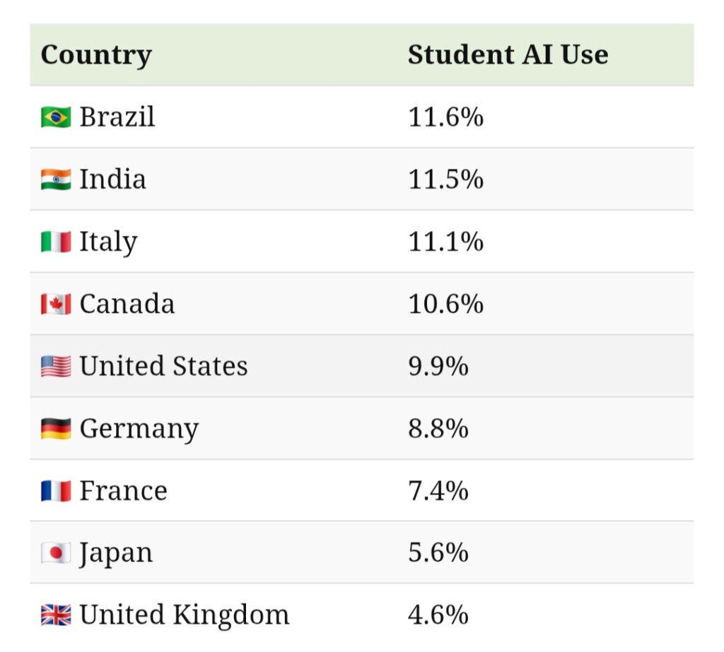 Brasil muncul sebagai negara dengan tingkat penggunaan AI tertinggi di kalangan pelajar, mencapai 11,6%. India menyusul sangat dekat dengan 11,5%, diikuti Italia 11,1%. Di kelompok negara maju, Kanada (10,6%) dan Amerika Serikat (9,9%) juga menunjukkan penetrasi yang relatif tinggi.